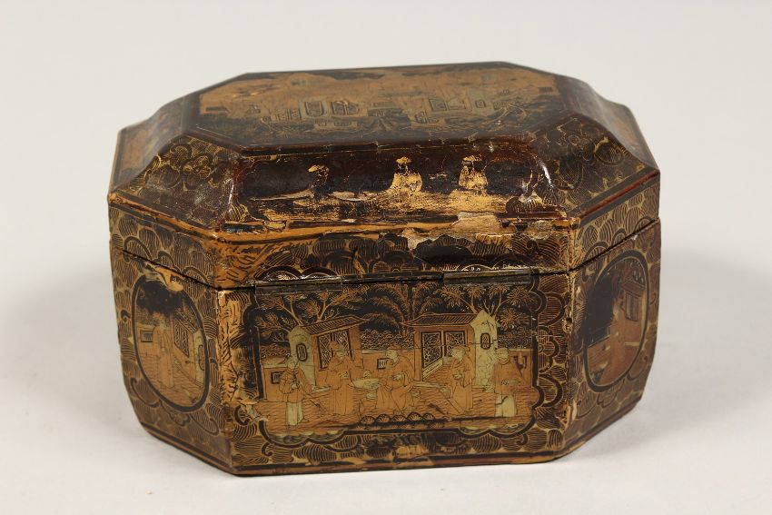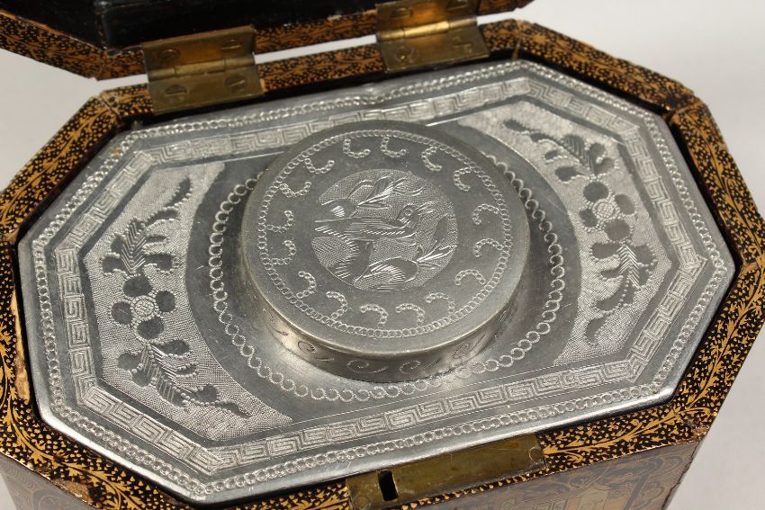 A CHINESE BLACK AND GILT TEA CADDY with pewter liner with top.
