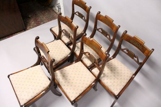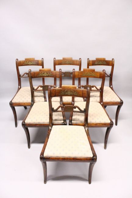 A SET OF SIX REGENCY ROSEWOOD BRASS INLAID SINGLE CHAIRS with drop in seats and sabre legs