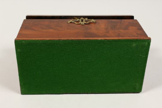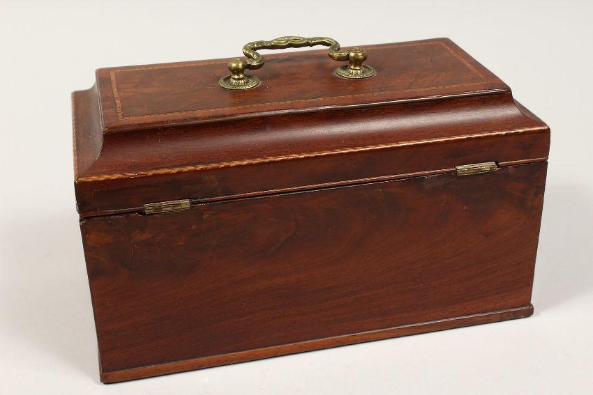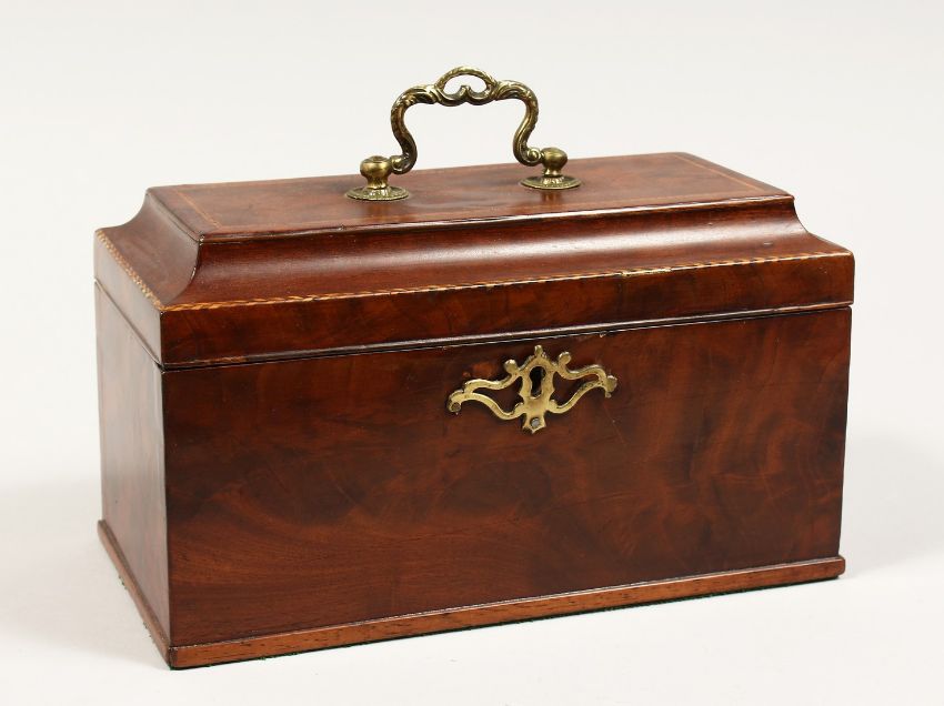 A GEORGE III MAHOGANY THREE DIVISION CADDY with banded top, brass carrying handle and escutcheon.