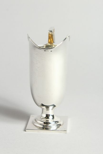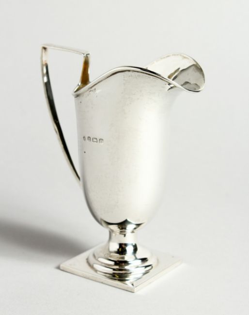 A HELMET-SHAPED SILVER CREAM JUG on a square base.