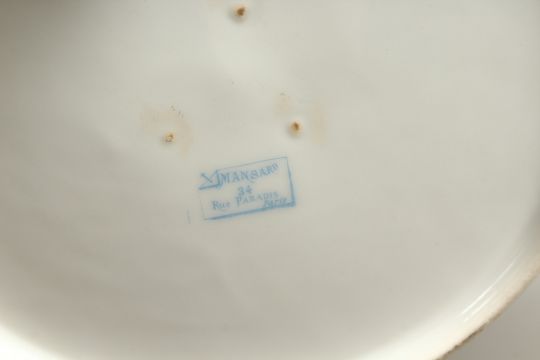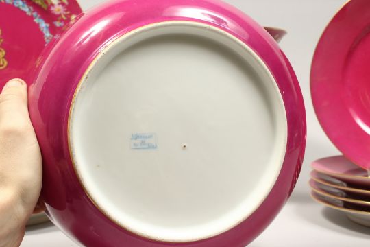 A GOOD QUALITY MANSAR OF PARIS PART DINNER SET, with pink ground, comprising 5 plain plates with crest, 9.5ins, matching large bowl, 10ins, a comport with crest and flowers, 8.5ins & 9 matching plates 9.5ins. (16).
