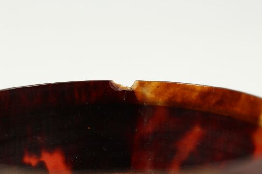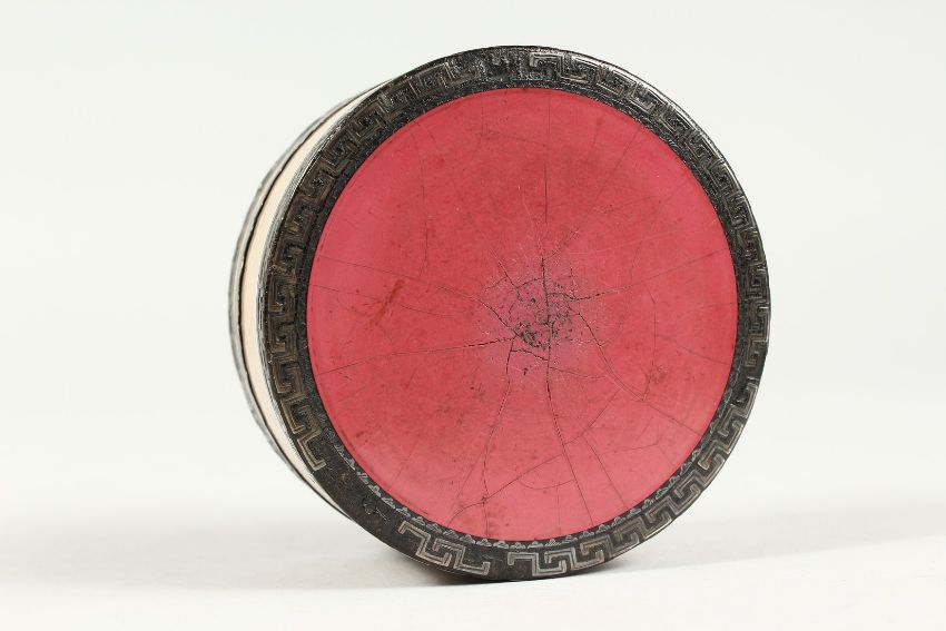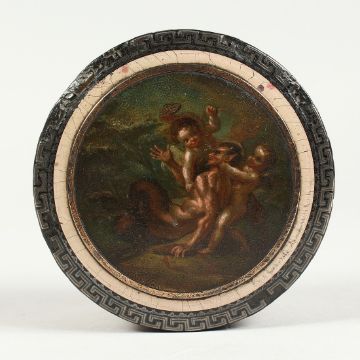 A GEORGIAN TORTOISESHELL CIRCULAR BOX with key pattern silver banding, the top painted with cupids.