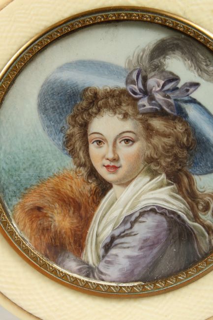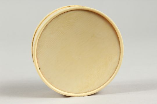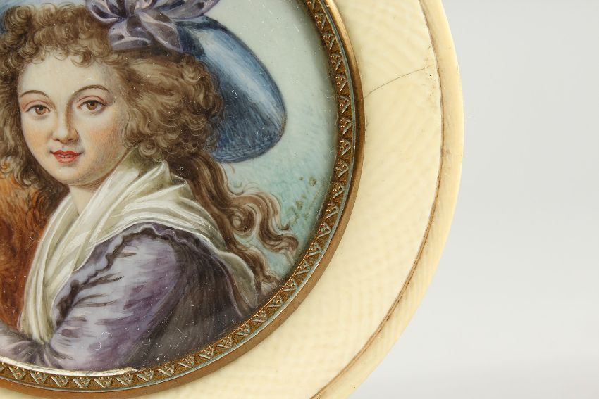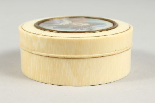 A GEORGIAN IVORY CIRCULAR BOX, the top painted with a portrait of a young lady in a plumed hat.