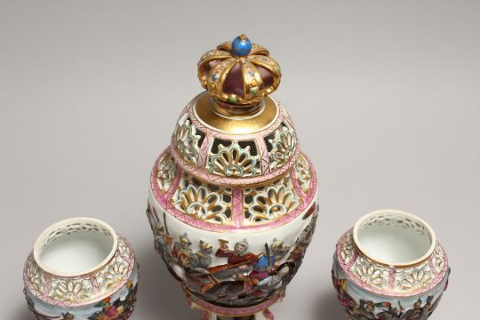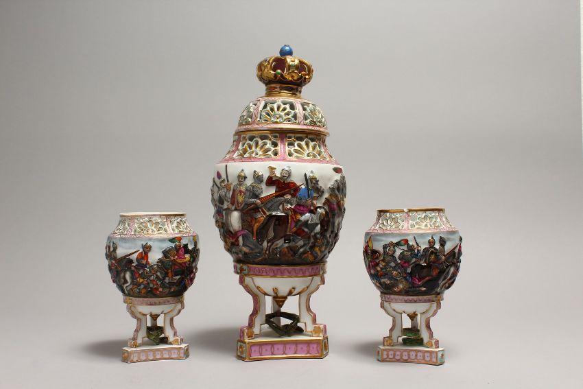 A CAPODIMONTE PORCELAIN PIERCED GARNITURE, large vase and cover and a pair of vases.