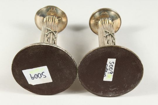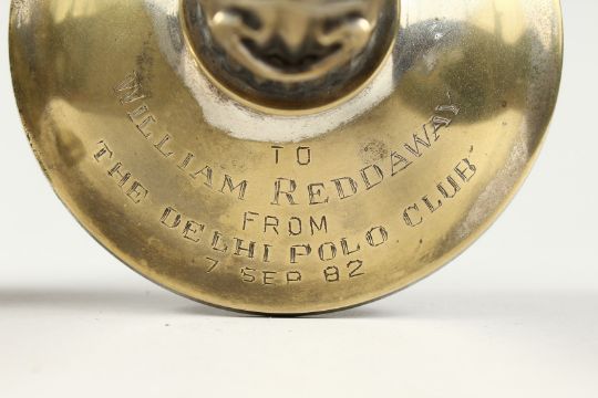 A PAIR OF POLO PRESENTATION CANDLESTICKS, 'To William Reddaway From The Delhi Polo Club', with cross sticks and horseshoe.