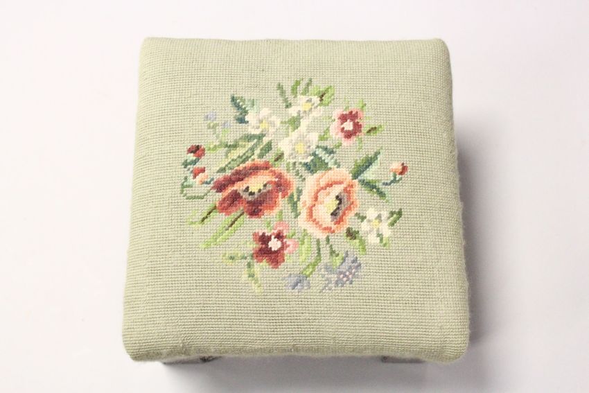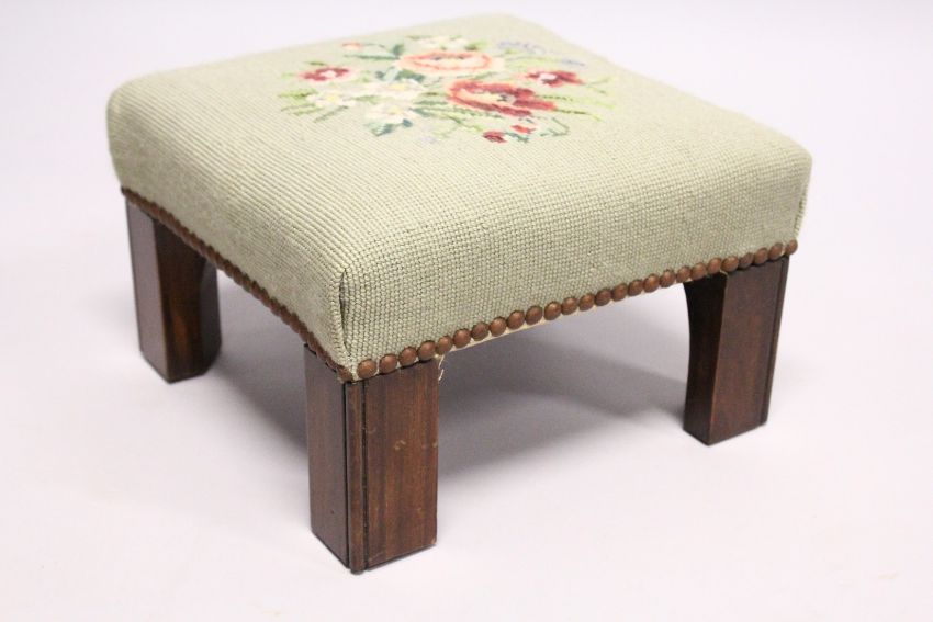 A SQUARE STOOL with needlework top.
