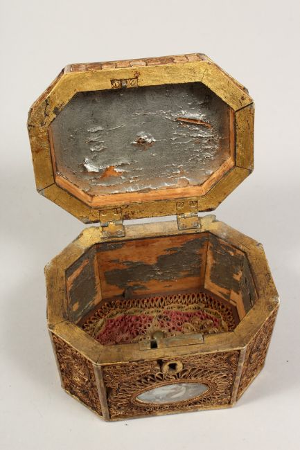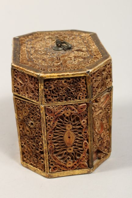 A GEORGE III ROLLED PAPER OCTAGONAL TEA CADDY inlaid with an oval.