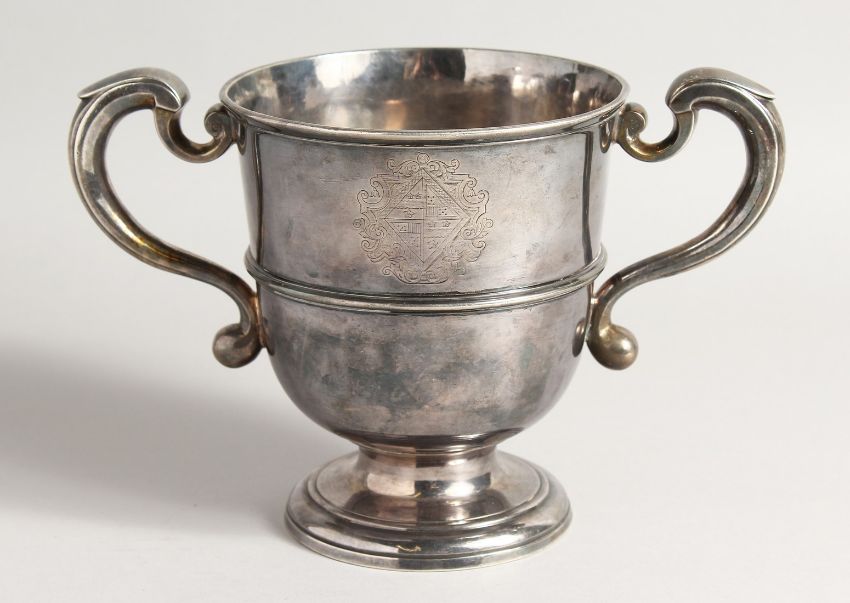 A FINE GEORGE I SILVER TWO HANDLED PEDESTAL CUP with scrolled handles,