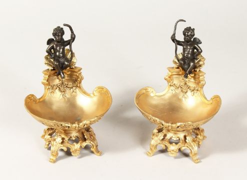A PAIR OF ORMOLU AND BRONZE CUPID SALTS