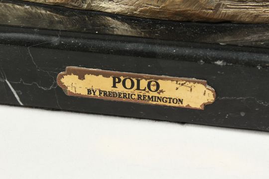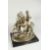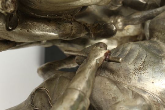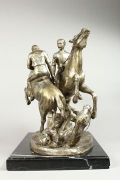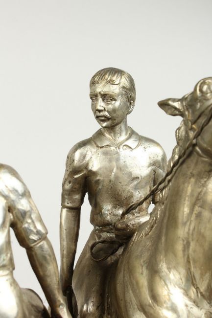 A SILVER BRONZE GROUP OF TWO RIDERS ON HORSEBACK, a horn and rider on the floor.