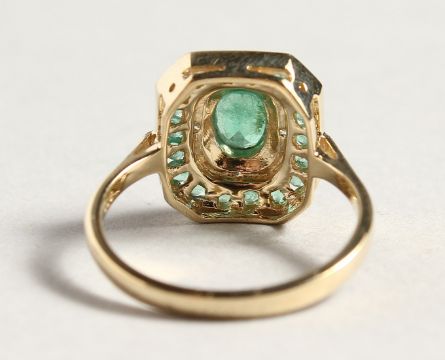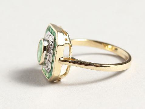 A 9CT GOLD EMERALD AND DIAMOND DECO STYLE RING