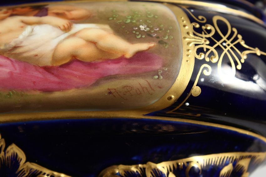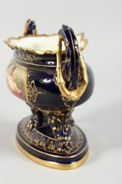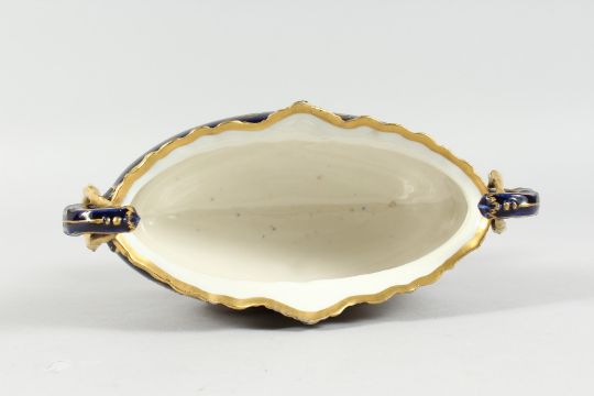 A 19TH CENTURY VIENNA PORCELAIN OVAL JARDINIERE, rich blue ground, edged in gilt and painted with ovals of cupids, mark in blue.