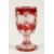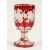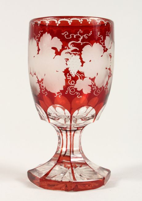 A GOOD BOHEMIAN RUBY GLASS GOBLET ethched with fruiting vines on an octagonal base.