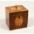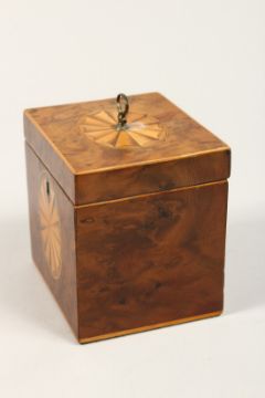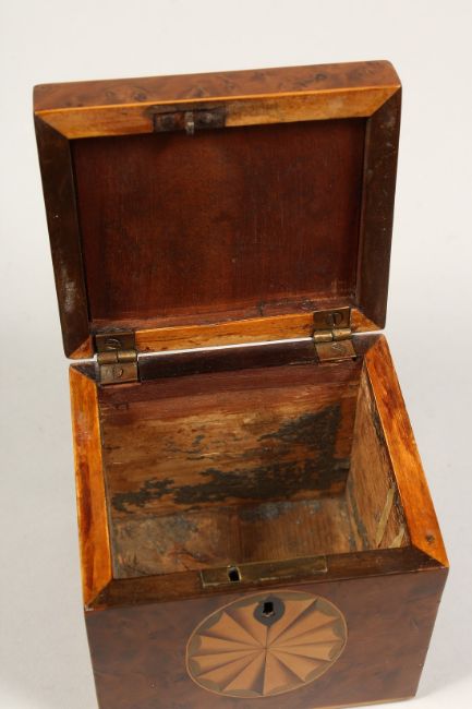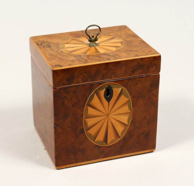 A SMALL GEORGE III SQUARE TEA CADDY with satinwood fan inlay.