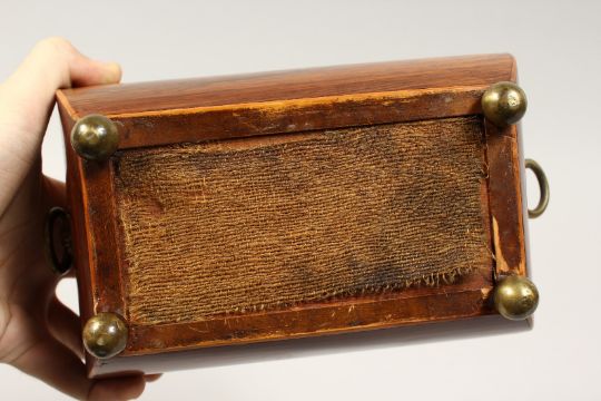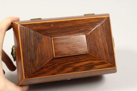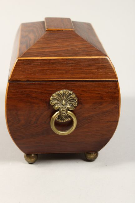 A REGENCY ROSEWOOD DOMED TOP TWO DIVISION TEA CADDY with brass handles and feet.