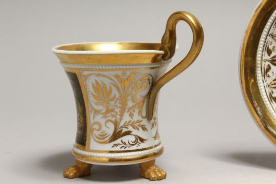 A BERLIN PORCELAIN CUP AND SAUCER, the cup on claw feet and painted with a classical landscape.