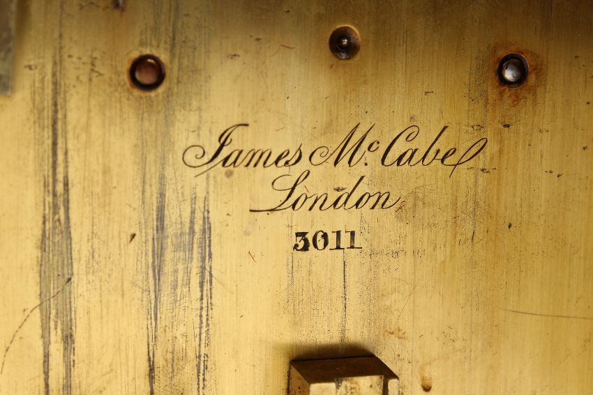 A VERY GOOD REGENCY BRACKET CLOCK by James McCabe with silvered dial movement, 3011.