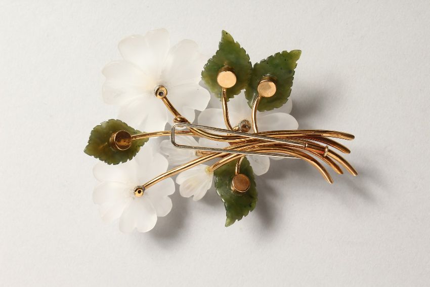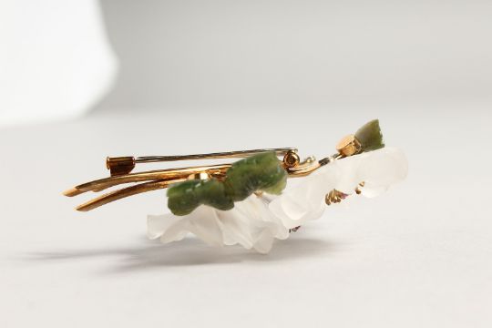 A SUPERB ROCK CRYSTAL, JADE AND RUBY BROOCH.
