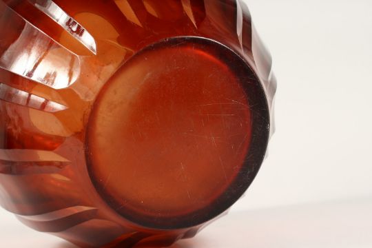 A LARGE HEAVY AMBER/ BROWN GLASS VASE.