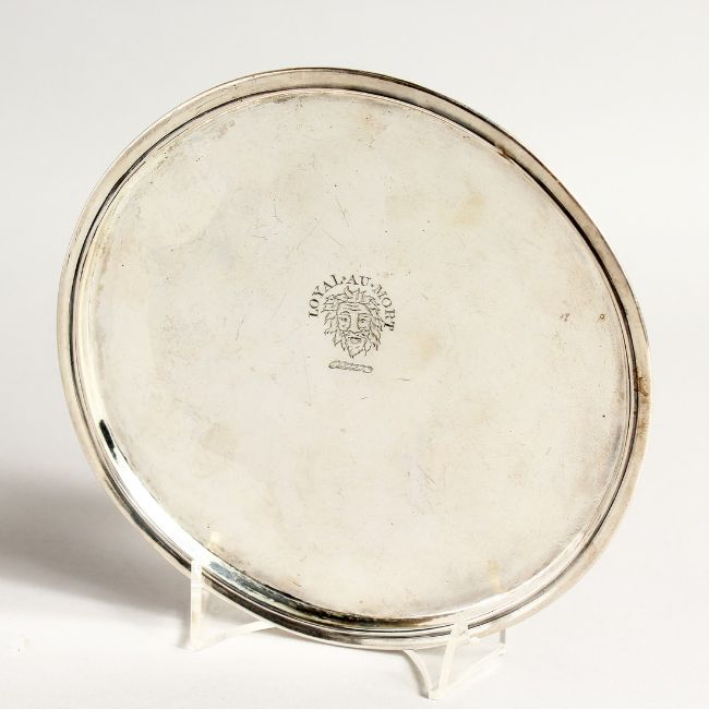 A GEORGE I IRISH SILVER CIRCULAR TAZZA with crest, Loyal. Au. Mort, with a face.