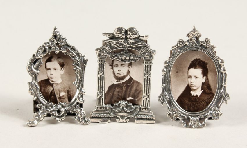 THREE CAST SILVER NOVELTY MINIATURE PHOTOGRAPH FRAMES
