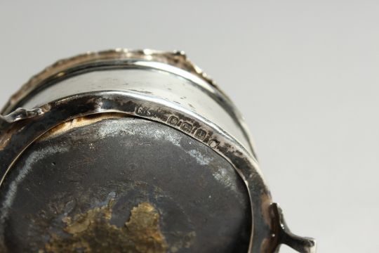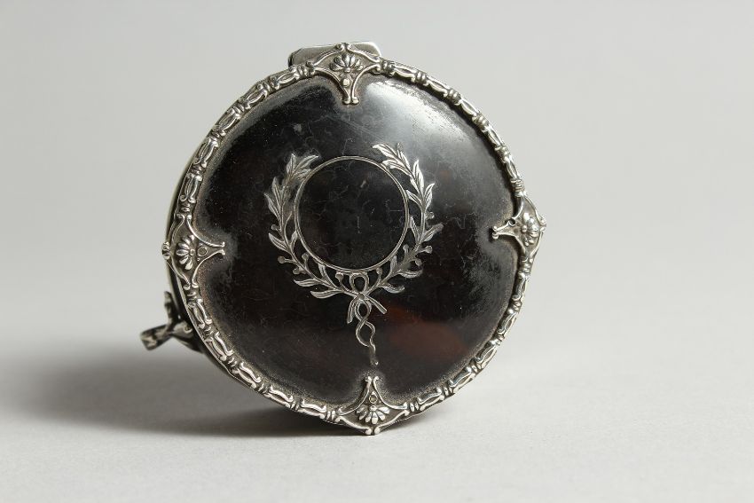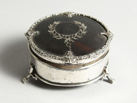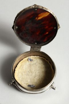 A GEORGE V SILVER AND TORTOISESHELL CIRCULAR PIN BOX, on three legs.