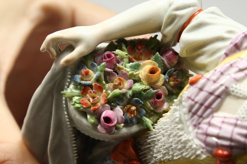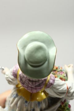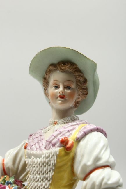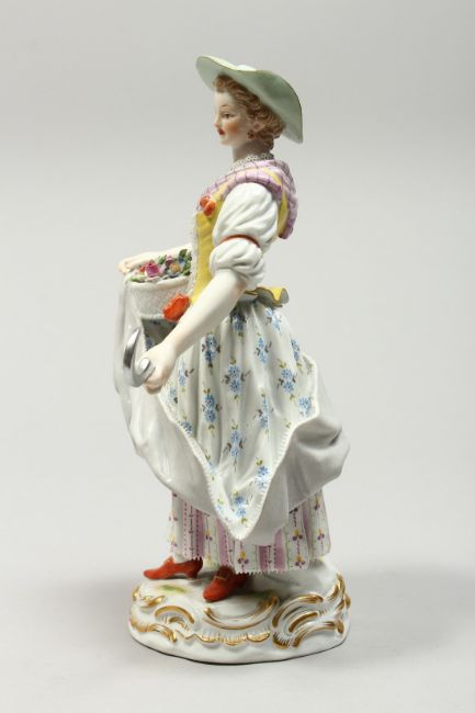 A GOOD MEISSEN PORCELAIN FIGURE OF A GARDENERESE, holding a sickle, carrying a basket of flowers, an urn by her side.