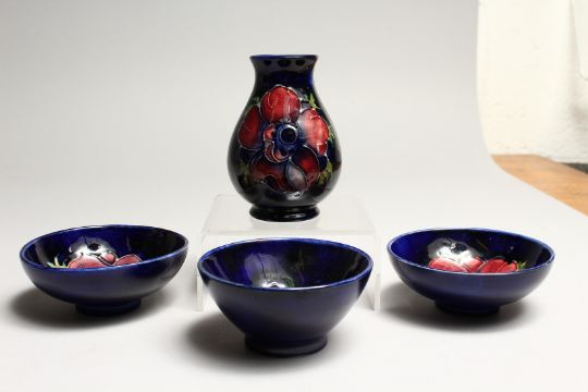 FOUR SMALL PIECES OF MOORCROFT a vase 3.5ins high and 3 bowls 3.5ins diameter.