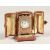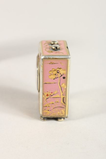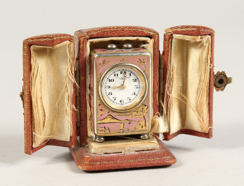 A SUPERB SMALL SILVER AND PINK ENAMEL CLOCK in a folding leather case.