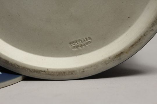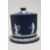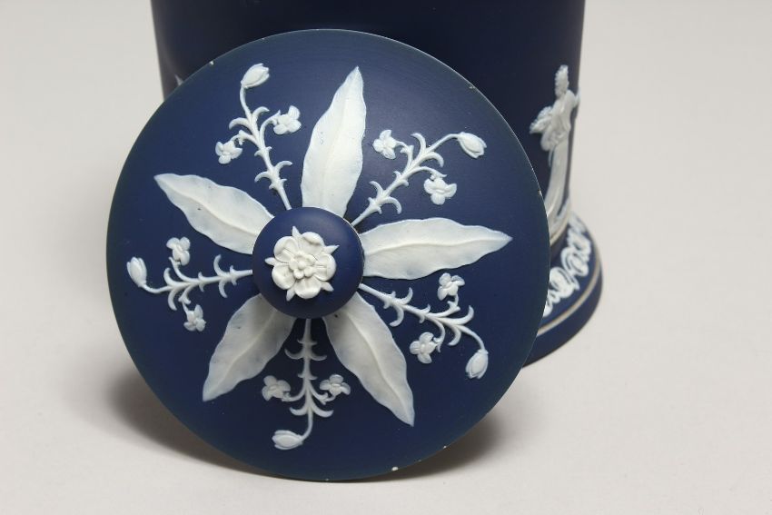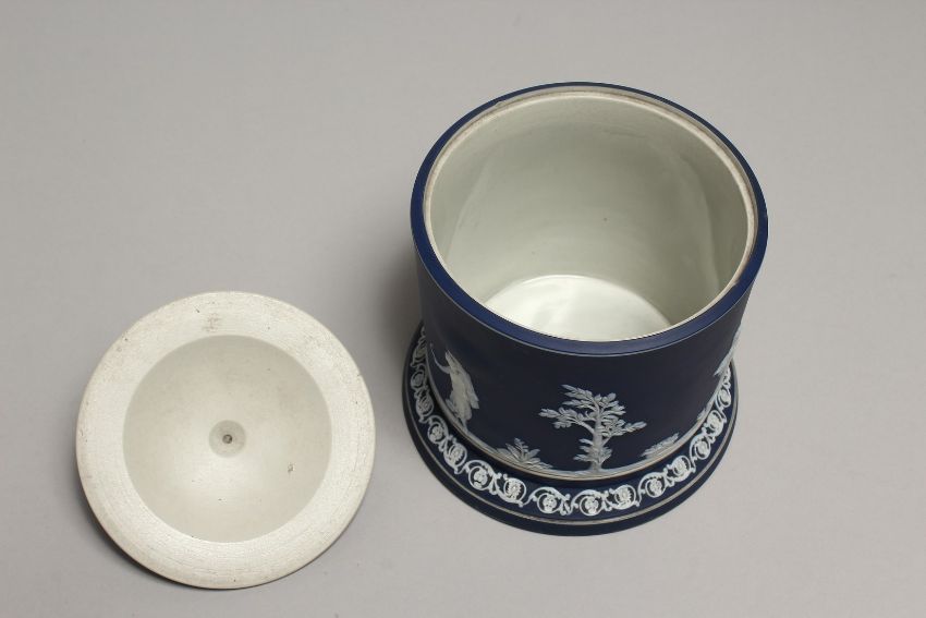 A GOOD ADAM BLUE AND WHITE JASPER WARE BISCUIT BARREL AND LID, decorated with depictions of the four seasons