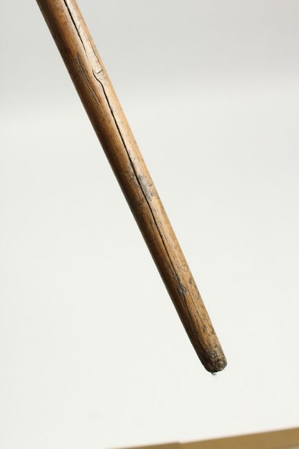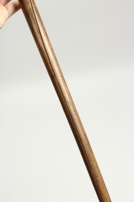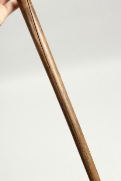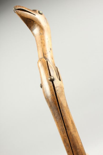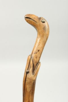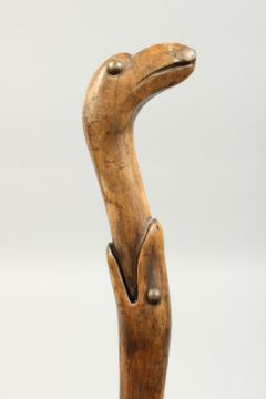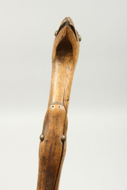 A RUSTIC WOODEN WALKING STICK, a snake eating a bird.