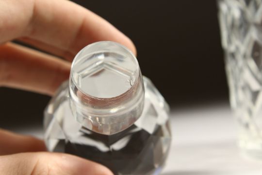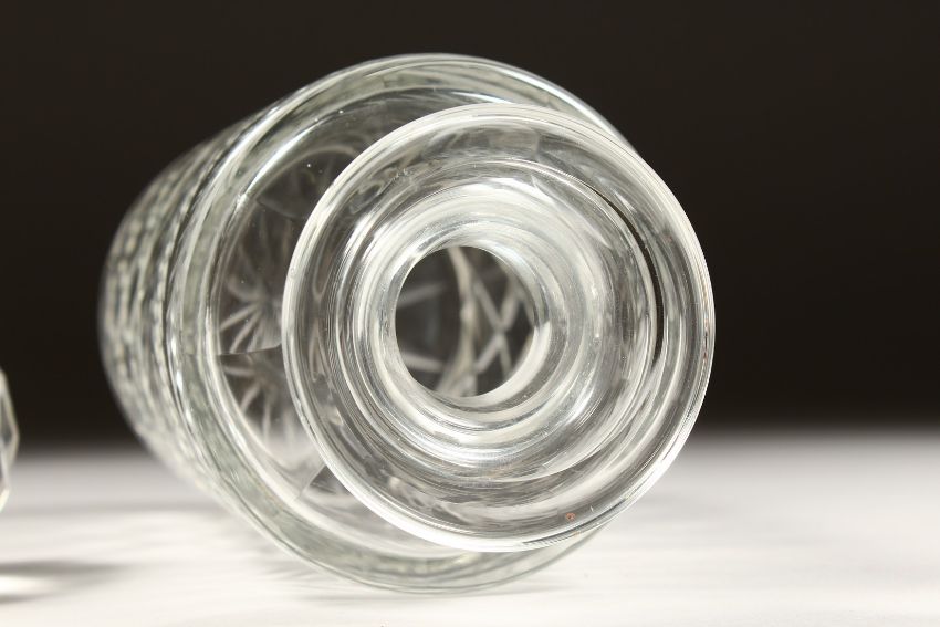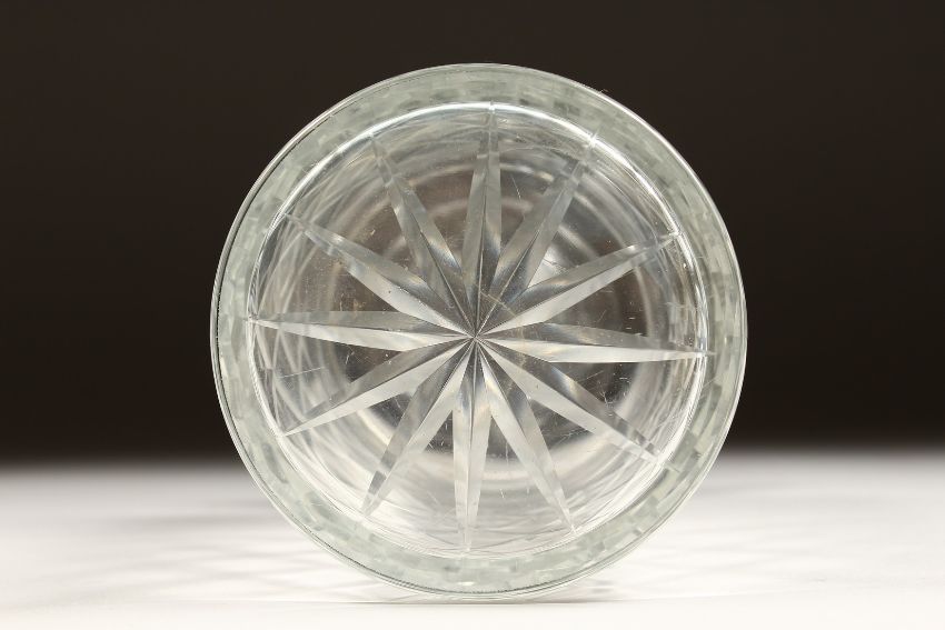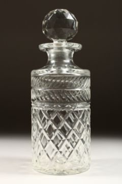 A CIRCULAR EINBURGH GLASS DECANTER AND STOPPER