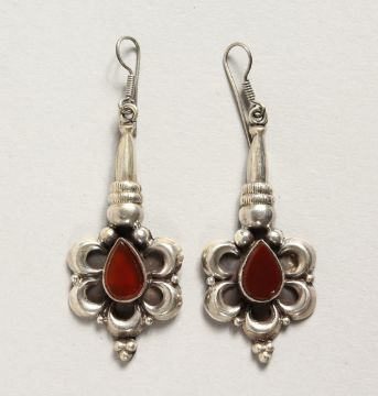 A PAIR OF SILVER AND AGATE DROP EAR RINGS