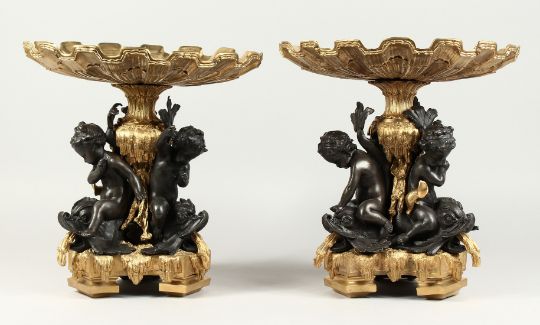A GOOD PAIR OF BRONZE AND GILT BRONZE COMPORTS with shell shaped tops, three cupid supports.