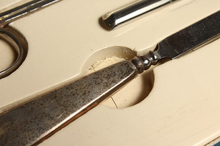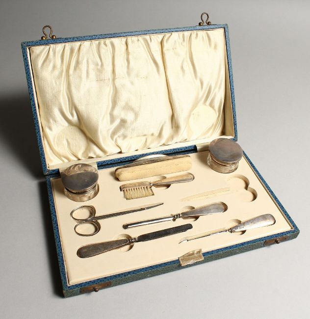 A SILVER MOUNTED MANICURE SET IN BOX.