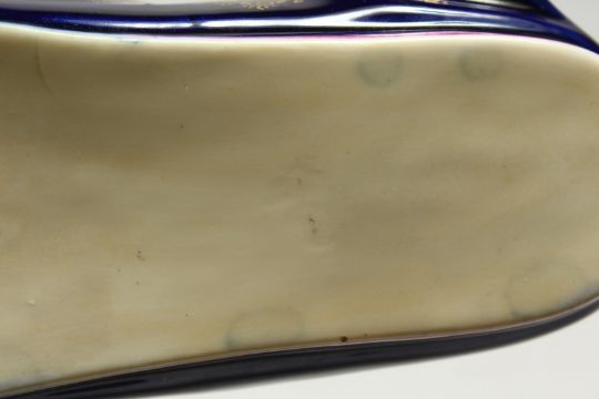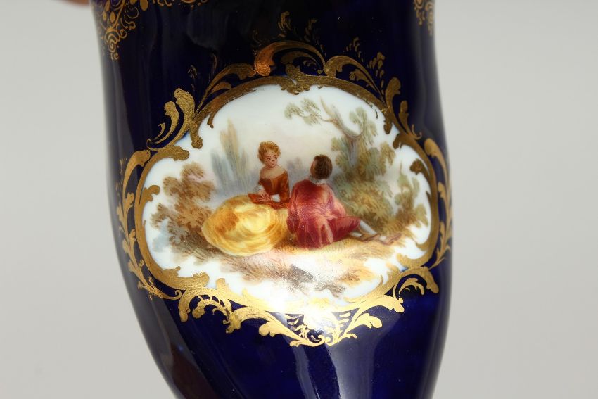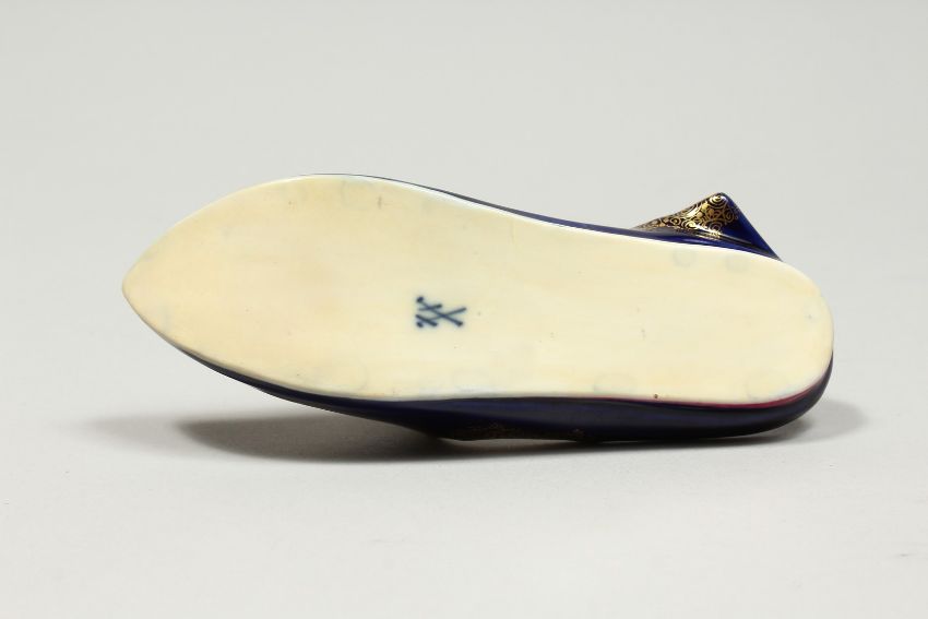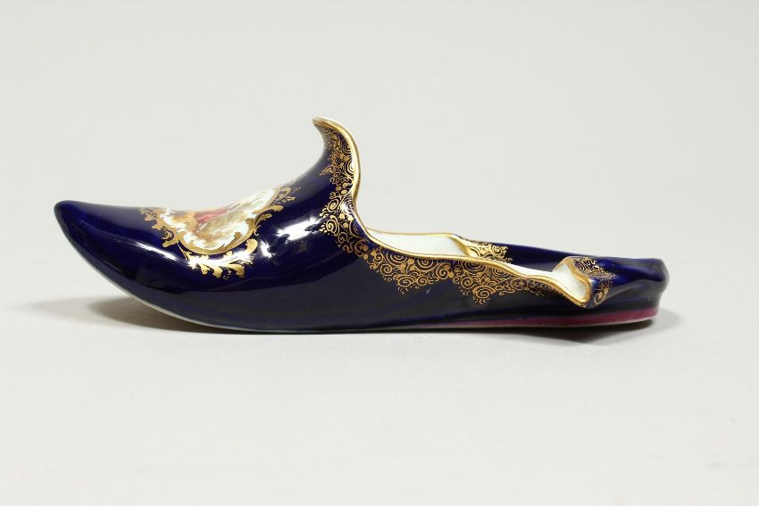 A GOOD MEISSEN PORCELAIN SLIPPER with rich blue ground edged in gilt and painted with an oval of young lovers.