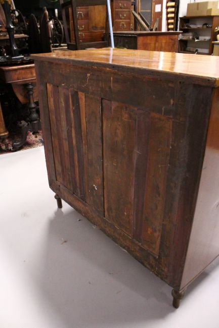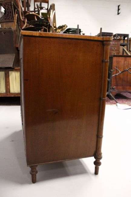 A GOOD MAHOGANY SATINWOOD THREE DRAWER COMMODE with crossbanded top, bamboo type column sides, oval brass handles and turned legs.