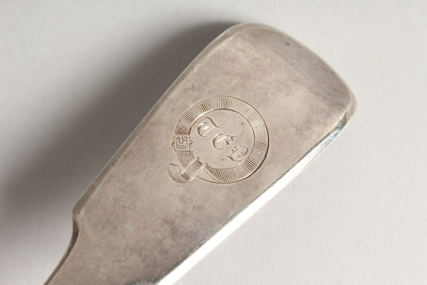 A WILLIAM IV FIDDLE PATTERN SILVER SOUP LADLE.