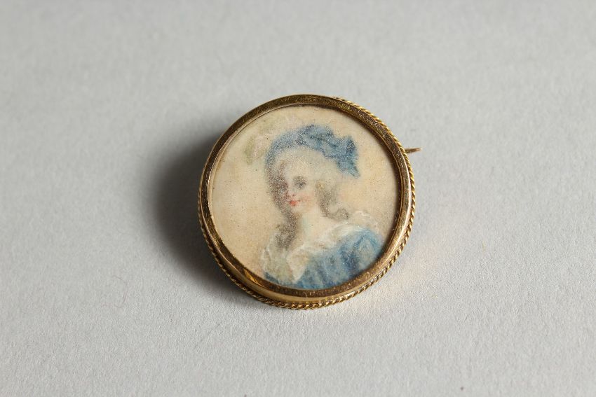 A SMALL 18 CT GOLD MINIATURE of a lady, as a brooch.