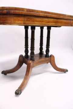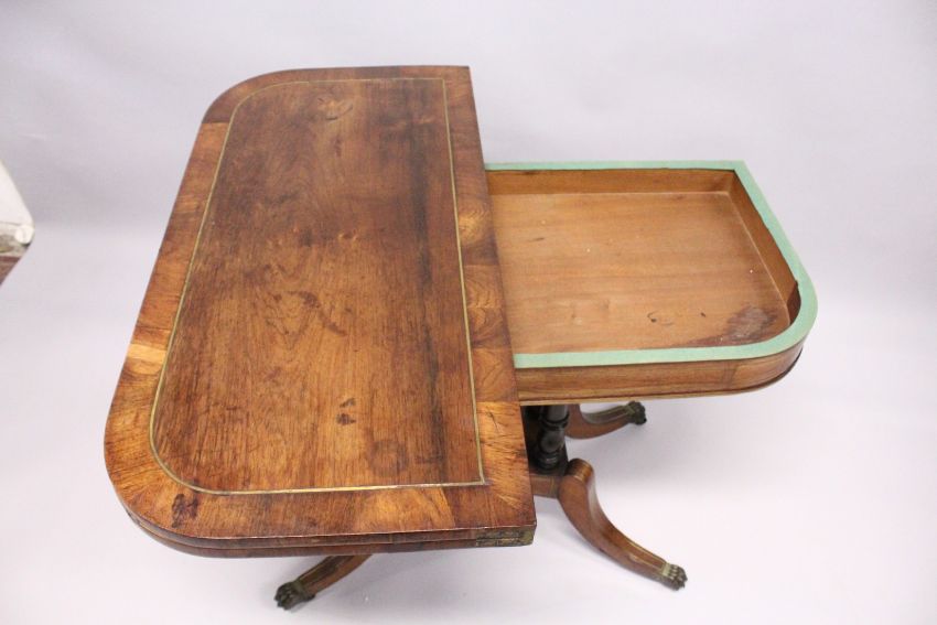 A MAHOGANY ROSEWOOD BRASS INLAID TILT SWIVEL TOP CARD TABLE, with green baize cover, four tuned supports with curving legs and brass claw casters.
