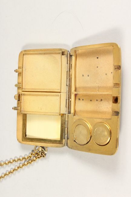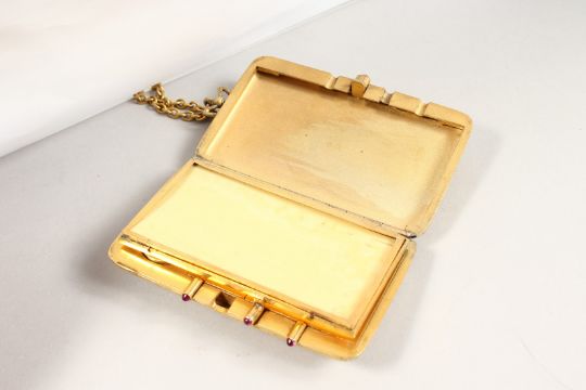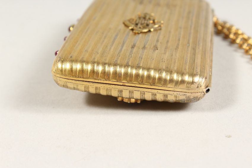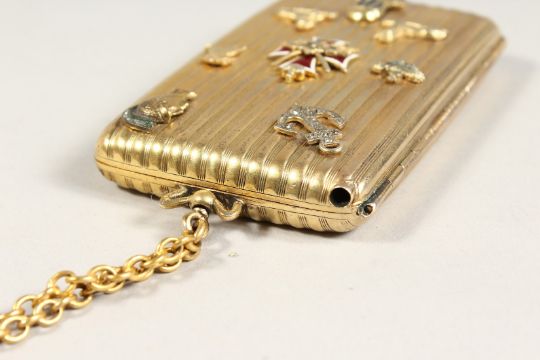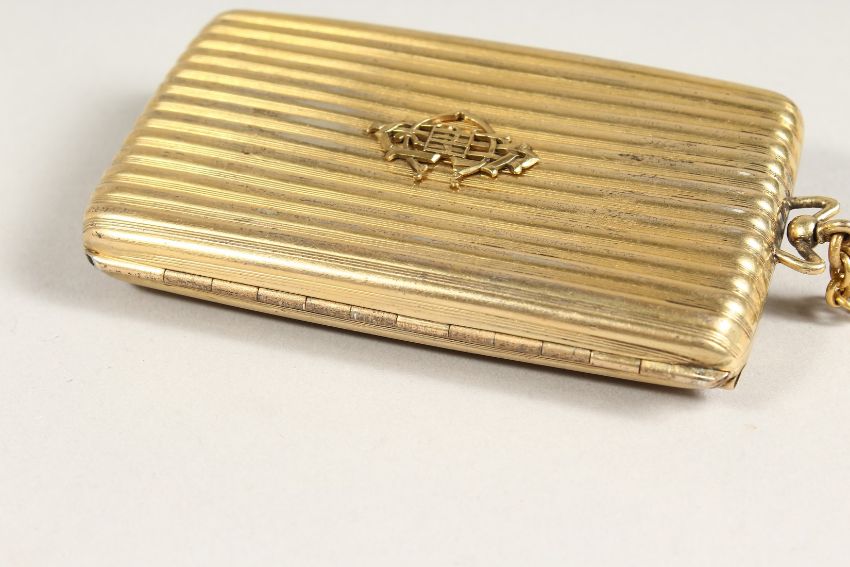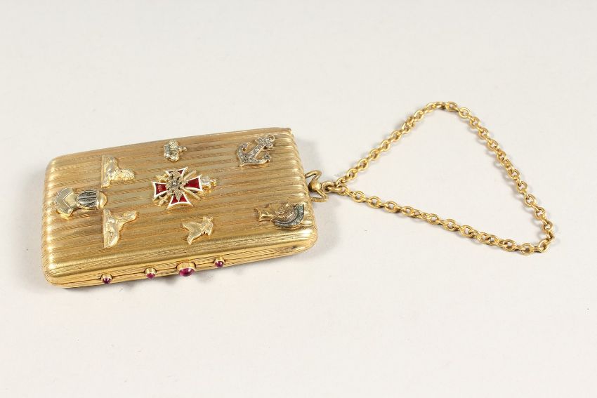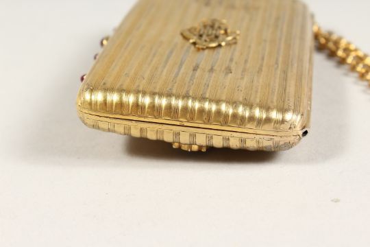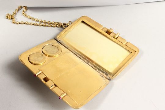 A SUPERB RUSSIAN SILVER GILT CASE with 2 coin holds, compact, etc., mounted with emblems, etc., on a chain.