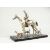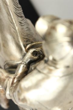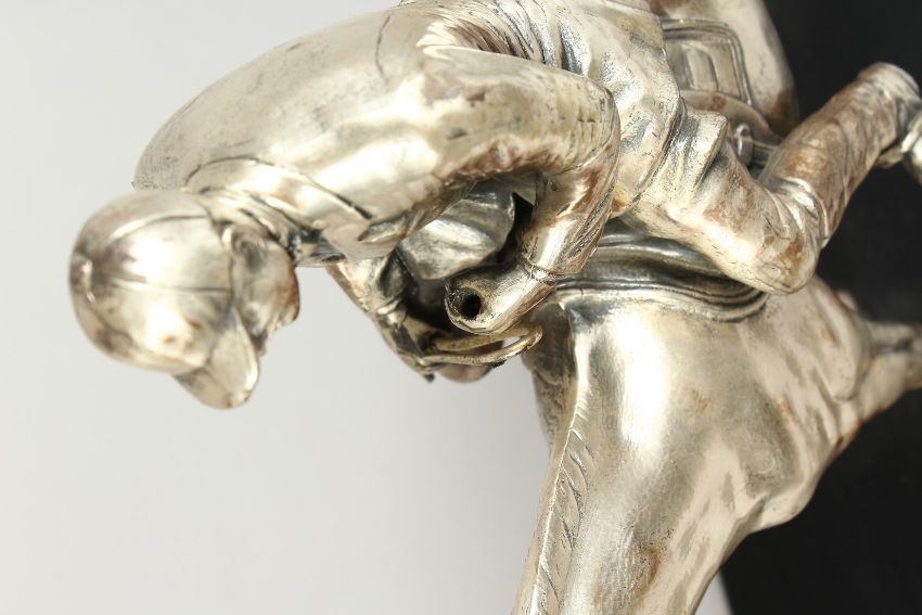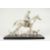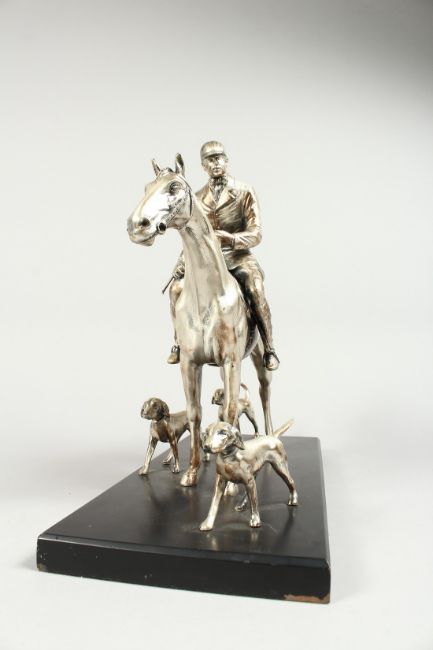 A SILVERED BRONZE GROUP HORSE AND RIDER, with their dogs, on a wooden base.