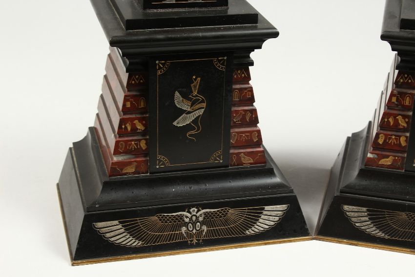A VERY GOOD PAIR OF EGYPTIAN MARBLE OBELISK with Egyptian figures and hieroglyphs.