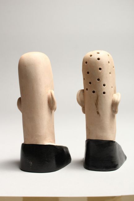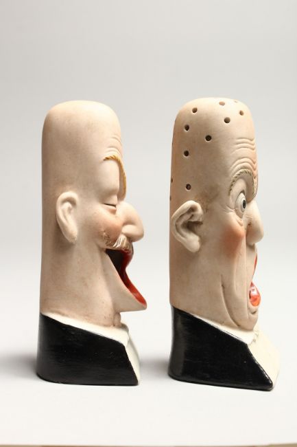 A PAIR OF POTTERY MEN'S HEADS ASHTRAYS.