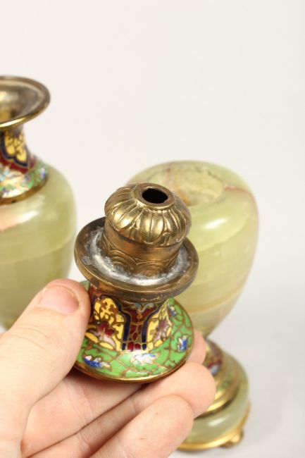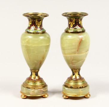 A GOOD SMALL PAIR OF FRENCH CHAMPAGNE ENAMEL AND ONYX VASES.