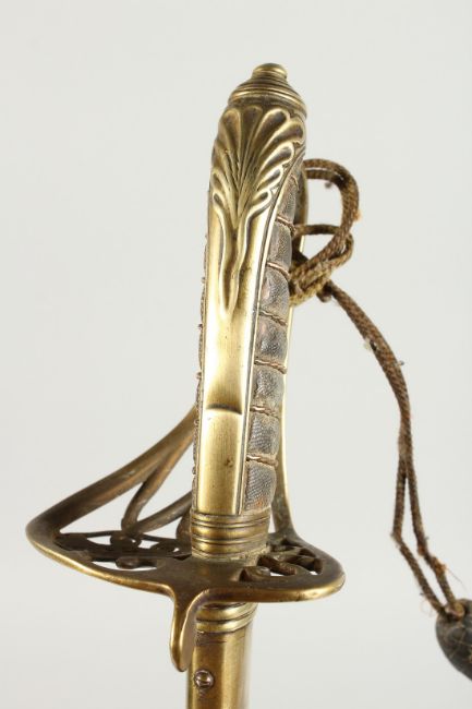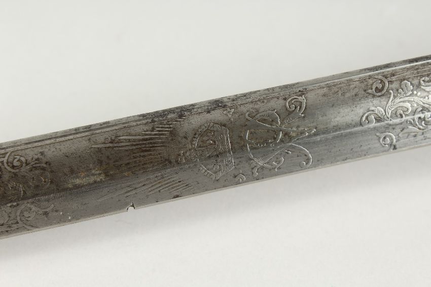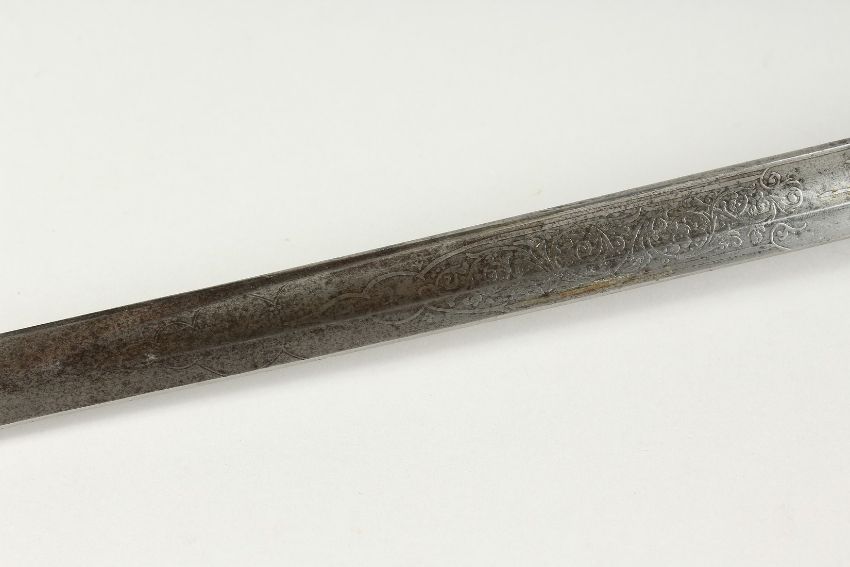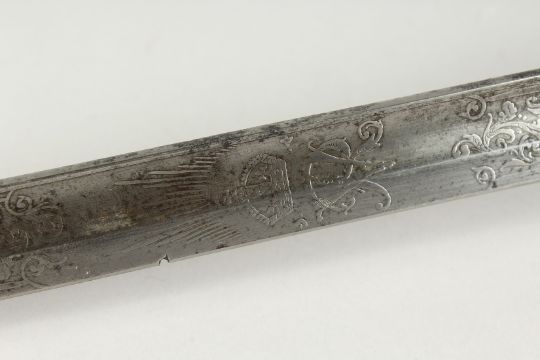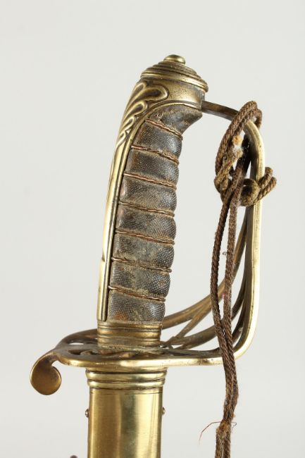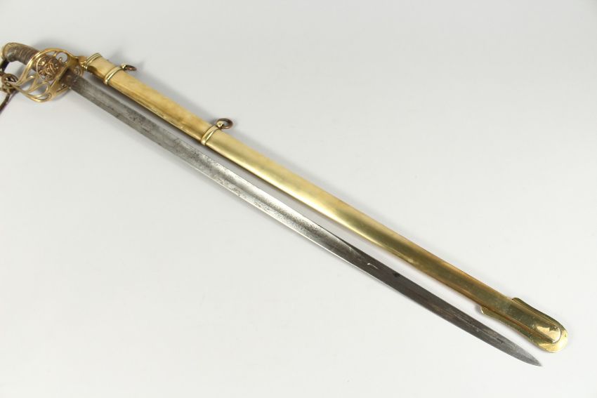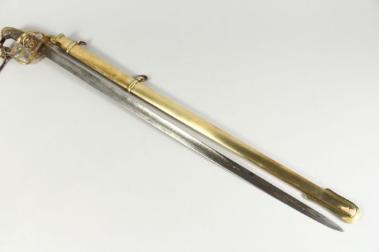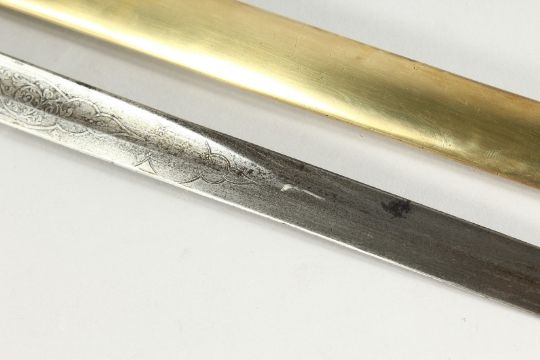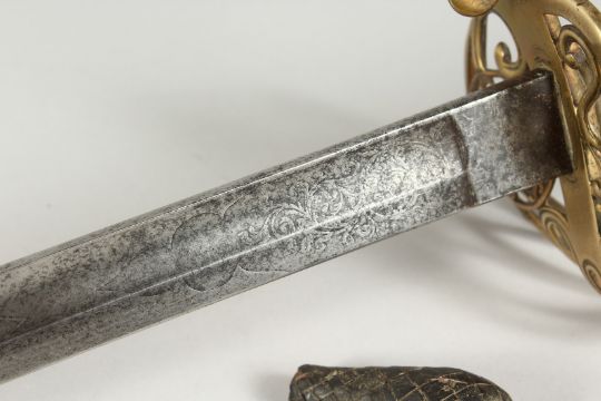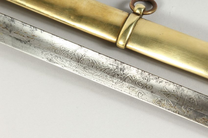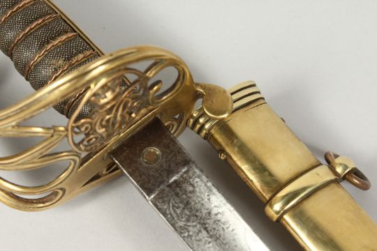 A GOOD VICTORIAN NAVAL SWORD with shagreen handle and engraved blade, V R & Crown inc., brown sheath.