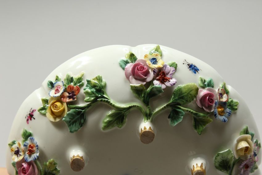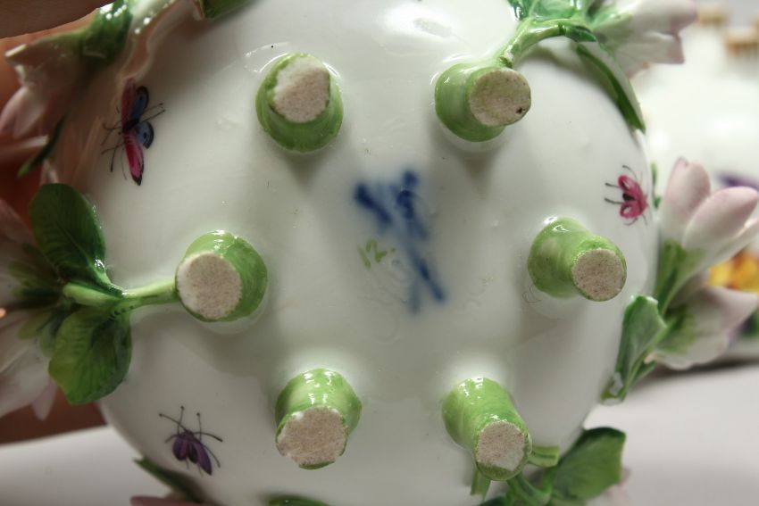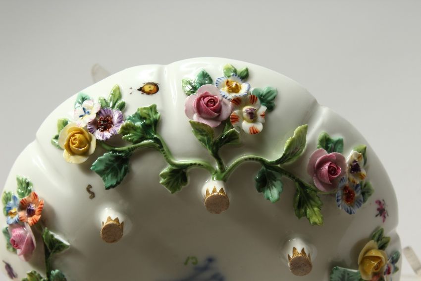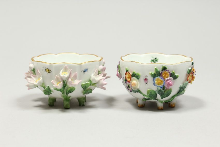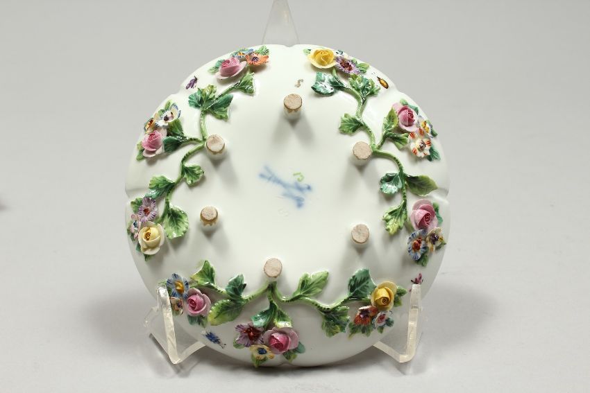 TWO MEISSEN PORCELAIN CUPS AND SAUCERS AND A SAUCER, encrusted with flowers and painted with insects.