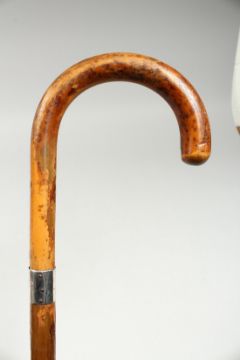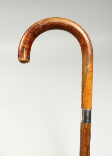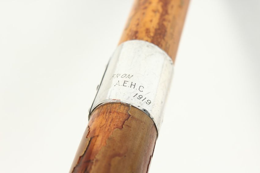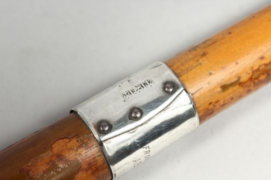 AN EDWARDIAN BENTWOOD CANE with silver handle, dated 1919.