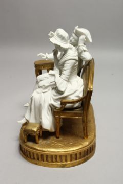 A SUPERB SEVRES WHITE BISQUE PORCELAIN AND ORMOLU GROUP, two figures sitting on an ormolu bench, stool and table, on an ormolu base.