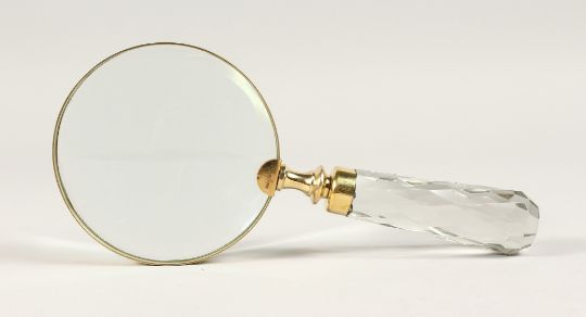A MAGNIFYING GLASS with a cut glass handle.